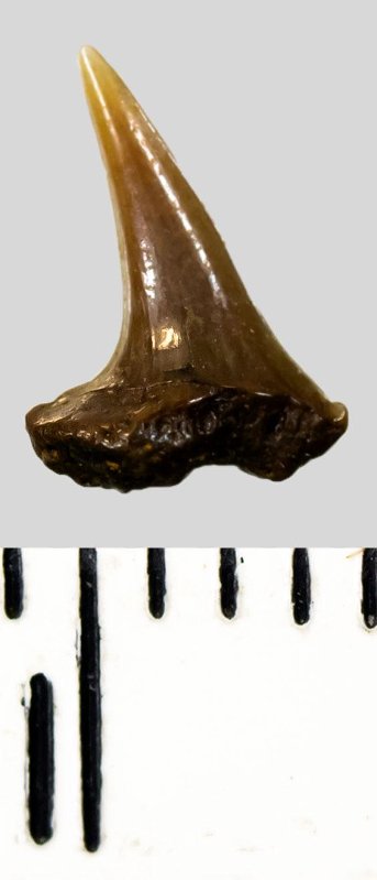 Коронка мелкого бокового зуба темно-коричневого цвета, режущего типа, S-образно изогнутая, с гладким режущим краем. Корень буро-охристый, сильно окатанный, сохранился фрагментарно.
