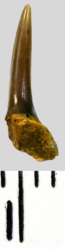 Коронка мелкого зуба темно-коричневого цвета, колюще-режущего типа, S-образно изогнутая, с гладким режущим краем. Корень охристый, сильно окатанный, сохранился фрагментарно.