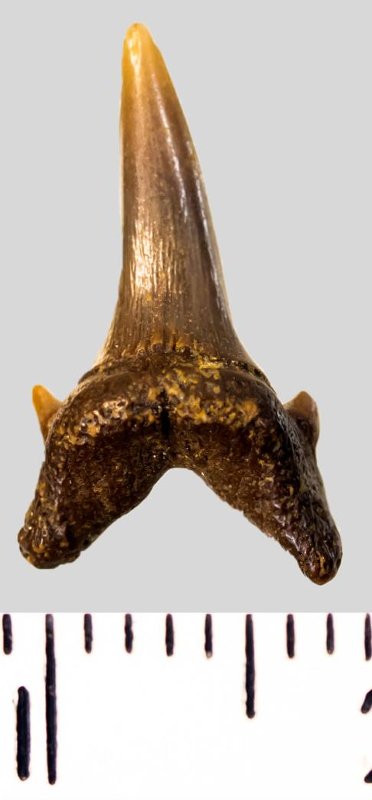 Мелкий передне-боковой (?) зуб с коронкой бурого цвета, режущего типа, S-образно изогнутой, с гладким режущим краем. С лингвальной стороны у основания коронки на эмали имеется скульптура в виде слабой продольной струйчатости. Корень бурый, арочный, умеренно массивный, со следами окатанности. С лингвальной стороны корня питательная борозда. Имеется одна пара добавочных зубцов коронки.