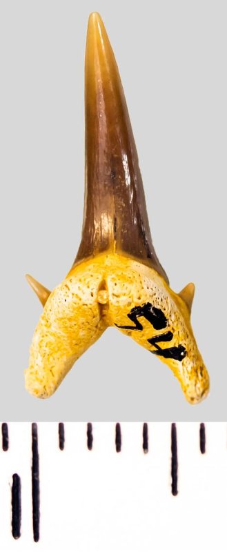 Мелкий зуб с коронкой бурого цвета, колюще-режущего типа, S-образно изогнутой, с гладким режущим краем. С лингвальной стороны у основания коронки на эмали имеется скульптура в виде слабой продольной струйчатости. Корень светло-охристый, арочный, умеренно массивный, со следами окатанности. С лингвальной стороны корня питательная борозда. Имеется одна пара добавочных зубцов коронки.