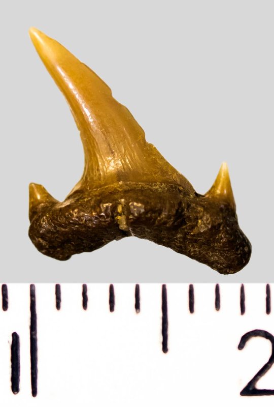 Мелкий боковой зуб с коронкой темно-охристого цвета, режущего типа, S-образно изогнутой, с гладким режущим краем. С лингвальной стороны у основания коронки на эмали имеется скульптура в виде слабой продольной струйчатости. Корень бурый, арочный, умеренно массивный, со следами окатанности и мелкими сколами. С лингвальной стороны корня питательная борозда. Имеется одна пара добавочных зубцов коронки.