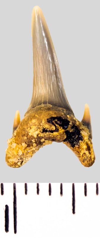 Мелкий передне-боковой (?) зуб с коронкой темно-серого цвета, режущего типа, S-образно изогнутой, с гладким режущим краем. С лингвальной стороны у основания коронки на эмали имеется скульптура в виде слабой продольной струйчатости. Корень темно-охристый, арочный, умеренно массивный, со следами окатанности. Имеется одна пара добавочных зубцов коронки.