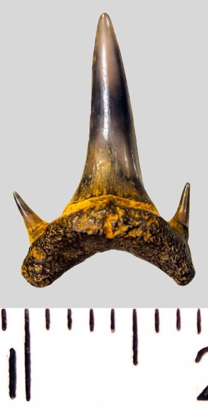 Мелкий боковой зуб с коронкой серо-бурого цвета, колюще-режущего типа, S-образно изогнутой, с гладким режущим краем. С лингвальной стороны у основания коронки на эмали имеется скульптура в виде слабой продольной струйчатости. Корень буро-охристый, арочный, умеренно массивный, со следами окатанности. С лингвальной стороны корня питательная борозда. Имеется одна пара добавочных зубцов коронки.