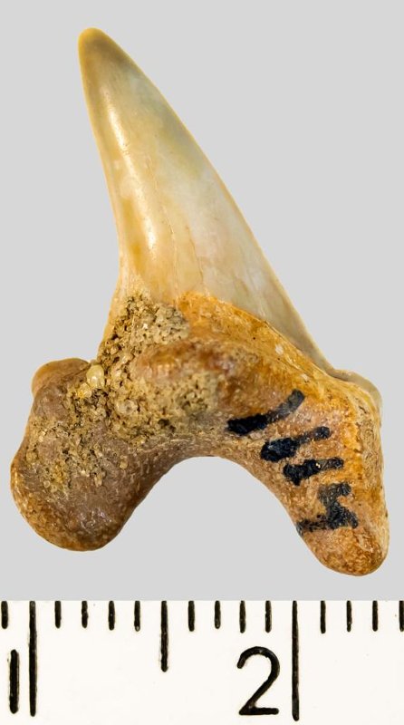 Средних размеров боковой зуб с коронкой светло-серого цвета, режущего типа, без скульптуры, с гладким режущим краем. Корень грязно-кремового цвета, арочный, умеренно массивный, с приостренным протуберанцем, широкими ветвями и U-образным вырезом между ними. С лингвальной стороны корня питательное отверстие. Имеется одна пара широких режущих добавочных зубцов коронки.