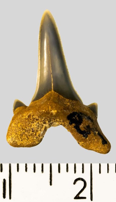 Средних размеров боковой зуб с коронкой темно-серого цвета, режущего типа, без скульптуры, с гладким режущим краем. Корень темно-охристый, арочный, умеренно массивный, с приостренным протуберанцем, широкими, субпрямоугольными ветвями и U-образным вырезом между ними. С лингвальной стороны корня питательное отверстие. Имеется одна пара широких режущих добавочных зубцов коронки.