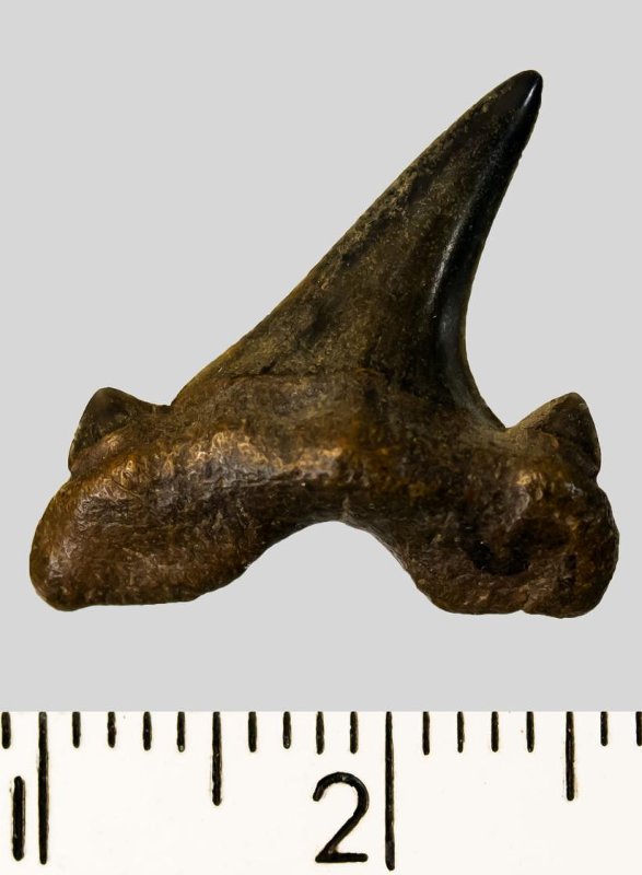 Средних размеров задне-боковой зуб с коронкой черного цвета, режущего типа, без скульптуры, с гладким режущим краем. Корень бурый, арочный, умеренно массивный, с приостренным протуберанцем, широкими, субпрямоугольными ветвями и U-образным вырезом между ними, со следами окатанности. С лингвальной стороны корня питательное отверстие. Имеется одна пара широких режущих добавочных зубцов коронки.