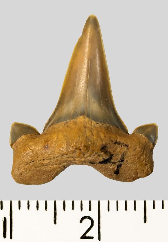 Средних размеров боковой зуб с коронкой серо-коричневого цвета, режущего типа, без скульптуры, с гладким режущим краем. Корень грязно-коричневый, арочный, умеренно массивный, с приостренным протуберанцем, широкими, субпрямоугольными ветвями и U-образным вырезом между ними, со следами окатанности. С лингвальной стороны корня питательное отверстие. Имеется одна пара широких режущих добавочных зубцов коронки.