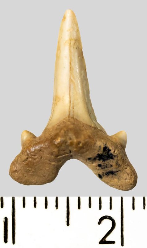 Средних размеров зуб с коронкой светло-серого цвета, режущего типа, без скульптуры, с гладким режущим краем. Корень темно-бежевый, арочный, умеренно массивный, с приостренным протуберанцем, широкими, субпрямоугольными ветвями и U-образным вырезом между ними, со следами окатанности. С лингвальной стороны корня питательное отверстие. Имеется одна пара широких режущих добавочных зубцов коронки.