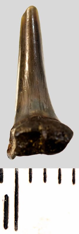 Зуб. Акула. Eostriatolamia subulata (Agassiz, 1843). Классификация: Хордовые Chordata, Позвоночные Vertebrata, Хрящевые рыбы Chondrichthyes, Пластиножаберные Elasmobranchii, Акулы Selachii, Ламнообразные Lamniformes, Песчаные акулы Odontaspididae