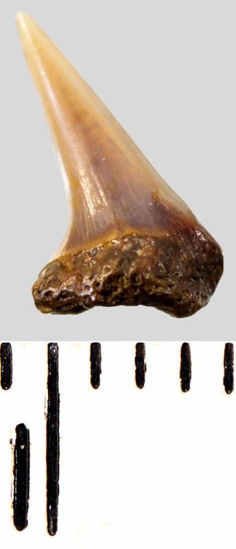 Зуб. Акула. Eostriatolamia subulata (Agassiz, 1843). Классификация: Хордовые Chordata, Позвоночные Vertebrata, Хрящевые рыбы Chondrichthyes, Пластиножаберные Elasmobranchii, Акулы Selachii, Ламнообразные Lamniformes, Песчаные акулы Odontaspididae