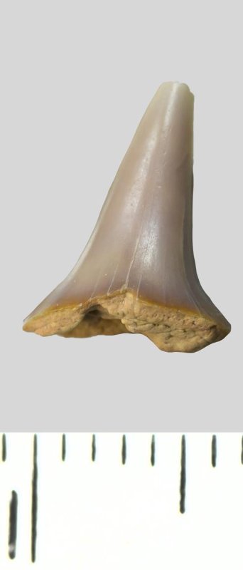 Зуб (фрагмент). Акула. Odontaspis venusta (Leriche, 1929). Классификация: Хордовые Chordata, Позвоночные Vertebrata, Хрящевые рыбы Chondrichthyes, Пластиножаберные Elasmobranchii