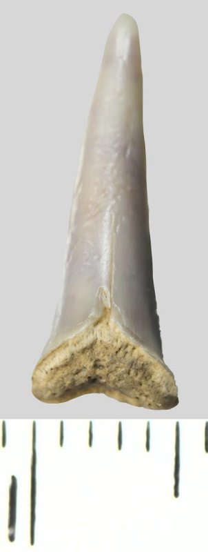 Зуб (фрагмент). Акула. Odontaspis venusta (Leriche, 1929). Классификация: Хордовые Chordata, Позвоночные Vertebrata, Хрящевые рыбы Chondrichthyes, Пластиножаберные Elasmobranchii