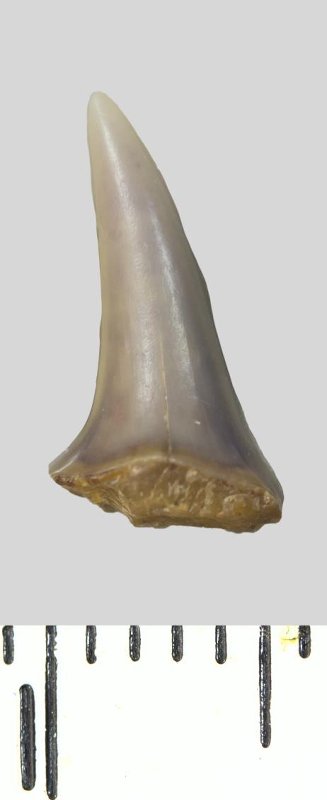 Зуб (фрагмент). Акула. Odontaspis venusta (Leriche, 1929). Классификация: Хордовые Chordata, Позвоночные Vertebrata, Хрящевые рыбы Chondrichthyes, Пластиножаберные Elasmobranchii