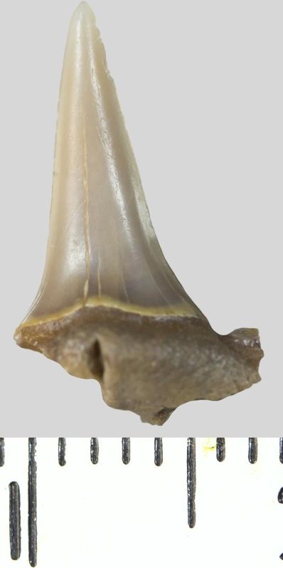 Зуб (фрагмент). Акула. Odontaspis venusta (Leriche, 1929). Классификация: Хордовые Chordata, Позвоночные Vertebrata, Хрящевые рыбы Chondrichthyes, Пластиножаберные Elasmobranchii