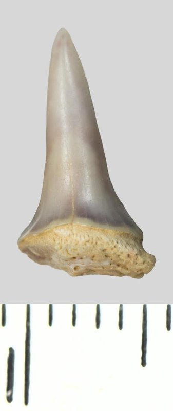Зуб (фрагмент). Акула. Odontaspis venusta (Leriche, 1929). Классификация: Хордовые Chordata, Позвоночные Vertebrata, Хрящевые рыбы Chondrichthyes, Пластиножаберные Elasmobranchii
