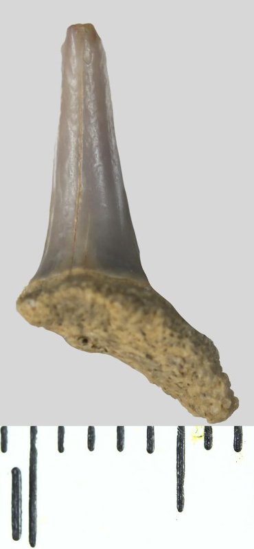 Зуб. Акула. Odontaspis venusta (Leriche, 1929). Классификация: Хордовые Chordata, Позвоночные Vertebrata, Хрящевые рыбы Chondrichthyes, Пластиножаберные Elasmobranchii