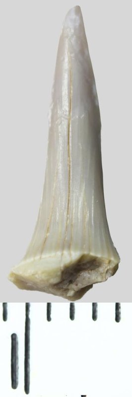 Зуб (фрагмент). Акула. Scapanorhynchus armenicus Glikman, 1980. Классификация: Хордовые Chordata, Позвоночные Vertebrata, Хрящевые рыбы Chondrichthyes, Пластиножаберные Elasmobranchii