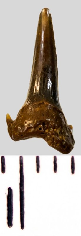 Зуб. Акула. Scapanorhynchus sp. Классификация: Хордовые Chordata, Позвоночные Vertebrata, Хрящевые рыбы Chondrichthyes, Пластиножаберные Elasmobranchii, Акулы Selachii, Ламнообразные Lamniformes