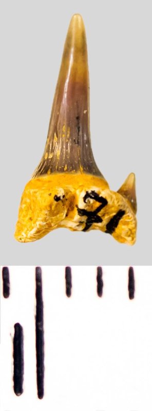 Мелкий боковой зуб с коронкой темно-бежевого цвета, колюще-режущего типа, S-образно изогнутой, с гладким режущим краем. С лингвальной стороны у основания коронки на эмали имеется скульптура в виде слабой продольной струйчатости. Корень охристый, арочный, умеренно массивный, со следами окатанности и мелкими сколами. С лингвальной стороны корня питательная борозда. Имелась одна пара добавочных зубцов коронки, сохранился только правый.