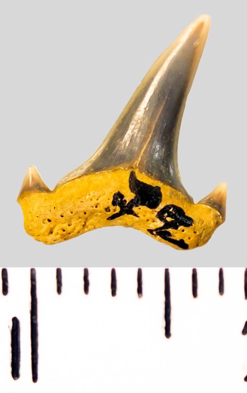 Мелкий боковой зуб с коронкой темно-серого цвета, режущего типа, S-образно изогнутой, с гладким режущим краем. С лингвальной стороны у основания коронки на эмали имеется скульптура в виде слабой продольной струйчатости. Корень охристый, арочный, умеренно массивный, со следами окатанности. Имеется одна пара добавочных зубцов коронки.