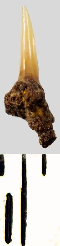 Мелкий боковой зуб с коронкой рыжевато-бежевого цвета, колюще-режущего типа, S-образно изогнутой, с гладким режущим краем. С лингвальной стороны у основания коронки на эмали имеется скульптура в виде слабой продольной струйчатости. Корень бурый, арочный, умеренно массивный, со следами окатанности, левая ветвь утрачена. Имеется одна питательная борозда с лингвальной стороны корня. Добавочные зубцы коронки зуба отсутствуют.