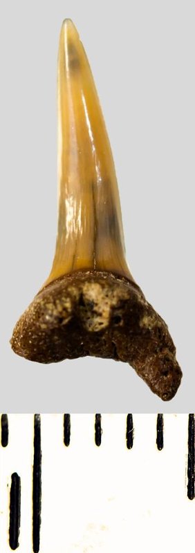 Мелкий боковой зуб с коронкой рыжевато-бежевого цвета, колюще-режущего типа, S-образно изогнутой, с гладким режущим краем. С лингвальной стороны у основания коронки на эмали имеется скульптура в виде слабой продольной струйчатости. Корень бурый, арочный, умеренно массивный, со следами окатанности, левая ветвь утрачена. Имеется одна питательная борозда с лингвальной стороны корня. Добавочные зубцы коронки зуба отсутствуют.