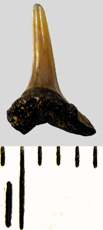 Мелкий боковой зуб с коронкой рыжевато-бежевого цвета, колюще-режущего типа, S-образно изогнутой, с гладким режущим краем. С лингвальной стороны у основания коронки на эмали имеется скульптура в виде слабой продольной струйчатости. Корень бурый, арочный, умеренно массивный, со следами окатанности, левая ветвь утрачена. Имеется одна питательная борозда с лингвальной стороны корня. Добавочные зубцы коронки зуба отсутствуют.