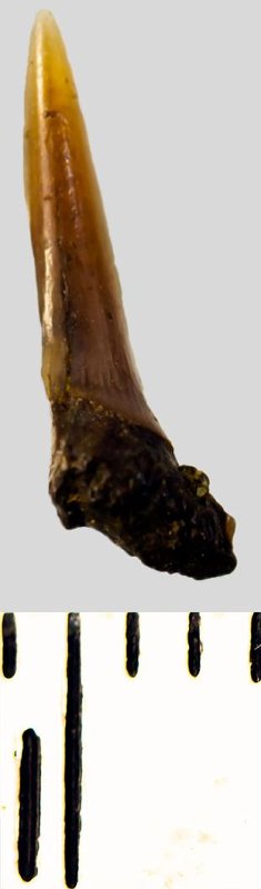 Мелкий боковой зуб с коронкой рыжевато-бежевого цвета, колюще-режущего типа, S-образно изогнутой, с гладким режущим краем. С лингвальной стороны у основания коронки на эмали имеется скульптура в виде слабой продольной струйчатости. Корень бурый, арочный, умеренно массивный, со следами окатанности, левая ветвь утрачена. Имеется одна питательная борозда с лингвальной стороны корня. Добавочные зубцы коронки зуба отсутствуют.