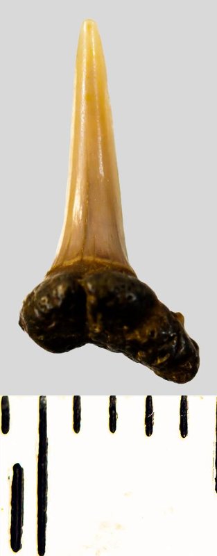 Мелкий боковой зуб с коронкой рыжевато-бежевого цвета, колюще-режущего типа, S-образно изогнутой, с гладким режущим краем. С лингвальной стороны у основания коронки на эмали имеется скульптура в виде слабой продольной струйчатости. Корень бурый, арочный, умеренно массивный, со следами окатанности, левая ветвь утрачена. Имеется одна питательная борозда с лингвальной стороны корня. Добавочные зубцы коронки зуба отсутствуют.