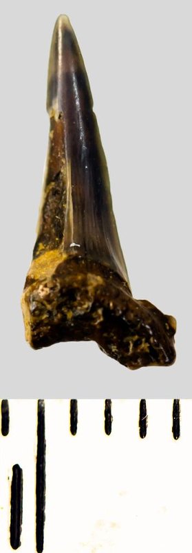 Мелкий боковой зуб с коронкой рыжевато-бежевого цвета, колюще-режущего типа, S-образно изогнутой, с гладким режущим краем. С лингвальной стороны у основания коронки на эмали имеется скульптура в виде слабой продольной струйчатости. Корень бурый, арочный, умеренно массивный, со следами окатанности, левая ветвь утрачена. Имеется одна питательная борозда с лингвальной стороны корня. Добавочные зубцы коронки зуба отсутствуют.