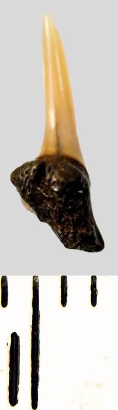 Мелкий боковой зуб с коронкой рыжевато-бежевого цвета, колюще-режущего типа, S-образно изогнутой, с гладким режущим краем. С лингвальной стороны у основания коронки на эмали имеется скульптура в виде слабой продольной струйчатости. Корень бурый, арочный, умеренно массивный, со следами окатанности, левая ветвь утрачена. Имеется одна питательная борозда с лингвальной стороны корня. Добавочные зубцы коронки зуба отсутствуют.