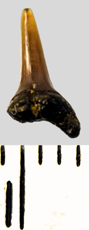 Мелкий боковой зуб с коронкой рыжевато-бежевого цвета, колюще-режущего типа, S-образно изогнутой, с гладким режущим краем. С лингвальной стороны у основания коронки на эмали имеется скульптура в виде слабой продольной струйчатости. Корень бурый, арочный, умеренно массивный, со следами окатанности, левая ветвь утрачена. Имеется одна питательная борозда с лингвальной стороны корня. Добавочные зубцы коронки зуба отсутствуют.