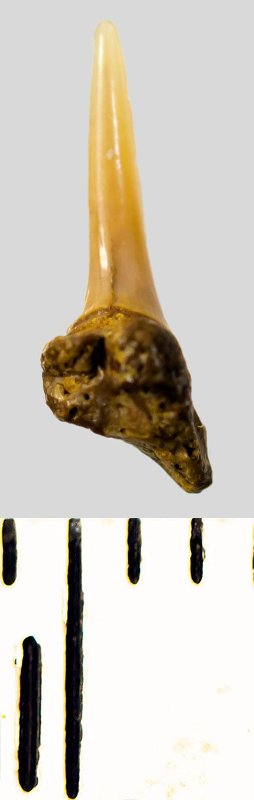 Мелкий боковой зуб с коронкой рыжевато-бежевого цвета, колюще-режущего типа, S-образно изогнутой, с гладким режущим краем. С лингвальной стороны у основания коронки на эмали имеется скульптура в виде слабой продольной струйчатости. Корень бурый, арочный, умеренно массивный, со следами окатанности, левая ветвь утрачена. Имеется одна питательная борозда с лингвальной стороны корня. Добавочные зубцы коронки зуба отсутствуют.