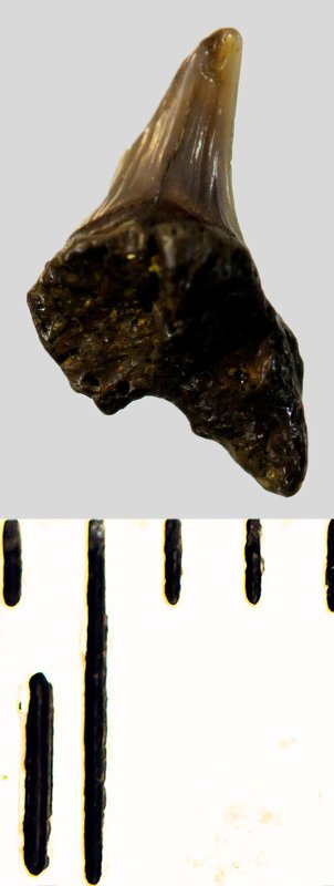 Мелкий боковой зуб с коронкой рыжевато-бежевого цвета, колюще-режущего типа, S-образно изогнутой, с гладким режущим краем. С лингвальной стороны у основания коронки на эмали имеется скульптура в виде слабой продольной струйчатости. Корень бурый, арочный, умеренно массивный, со следами окатанности, левая ветвь утрачена. Имеется одна питательная борозда с лингвальной стороны корня. Добавочные зубцы коронки зуба отсутствуют.
