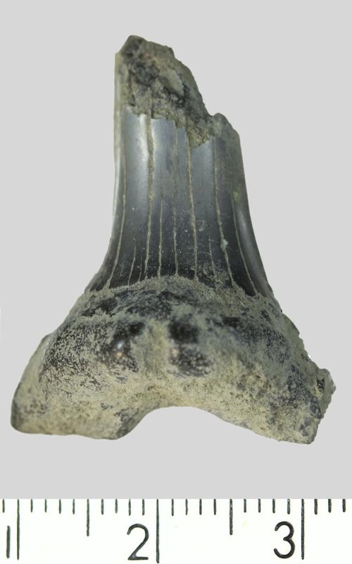Зуб. Акула. Hispidaspis sp. Классификация: Хордовые Chordata, Позвоночные Vertebrata, Хрящевые рыбы Chondrichthyes, Пластиножаберные Elasmobranchii