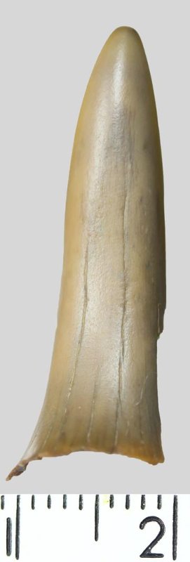 Зуб (фрагмент). Акула. Scapanorhynchus gigas Woodward, 1889. Классификация: Хордовые Chordata, Позвоночные Vertebrata, Хрящевые рыбы Chondrichthyes, Пластиножаберные Elasmobranchii