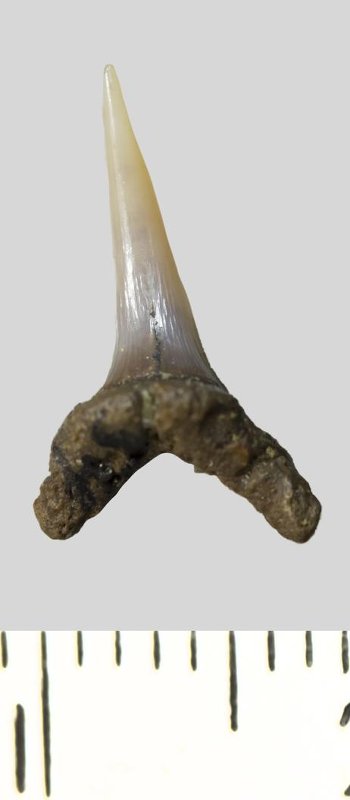 Зуб. Акула. Eostriatolamia sp. Классификация: Хордовые Chordata, Позвоночные Vertebrata, Хрящевые рыбы Chondrichthyes, Пластиножаберные Elasmobranchii