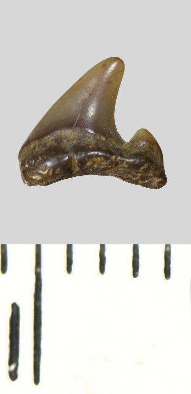 Зуб. Акула. Eostriatolamia subulata (Agassiz, 1843). Классификация: Хордовые Chordata, Позвоночные Vertebrata, Хрящевые рыбы Chondrichthyes, Пластиножаберные Elasmobranchii