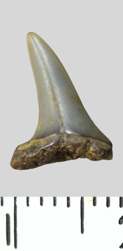 Зуб (фрагмент). Акула. Eostriatolamia venusta Leriche, 1906. Классификация: Хордовые Chordata, Позвоночные Vertebrata, Хрящевые рыбы Chondrichthyes, Пластиножаберные Elasmobranchii