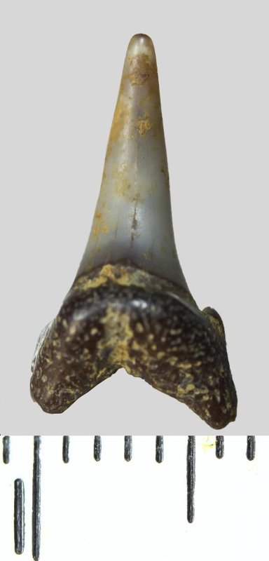 Зуб. Акула. Eostriatolamia venusta Leriche, 1906. Классификация: Хордовые Chordata, Позвоночные Vertebrata, Хрящевые рыбы Chondrichthyes, Пластиножаберные Elasmobranchii