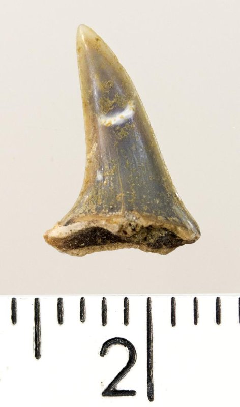 Зуб (фрагмент). Акула. Hypotodus sp. Классификация: Хордовые Chordata, Позвоночные Vertebrata, Хрящевые рыбы Chondrichthyes, Пластиножаберные Elasmobranchii