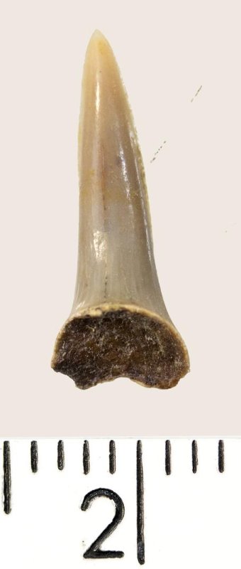 Зуб (фрагмент). Акула. Hypotodus sp. Классификация: Хордовые Chordata, Позвоночные Vertebrata, Хрящевые рыбы Chondrichthyes, Пластиножаберные Elasmobranchii