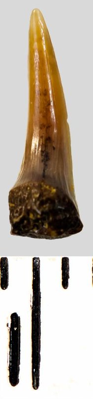 Зуб. Акула. Eostriatolamia subulata (Agassiz, 1843). Классификация: Хордовые Chordata, Позвоночные Vertebrata, Хрящевые рыбы Chondrichthyes, Пластиножаберные Elasmobranchii, Акулы Selachii, Ламнообразные Lamniformes, Песчаные акулы Odontaspididae