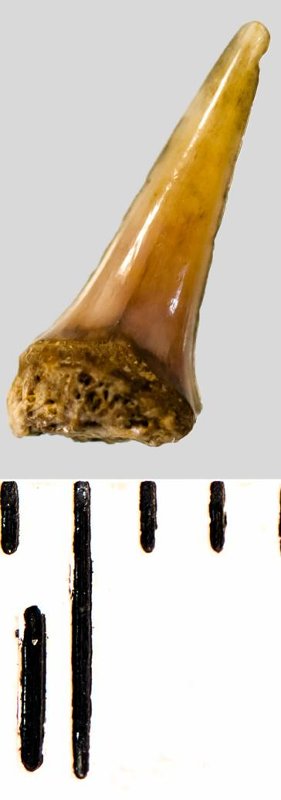 Коронка мелкого бокового зуба коричневого цвета, колюще-режущего типа, S-образно изогнутой, с гладким режущим краем. С лингвальной стороны у основания коронки на эмали имеется скульптура в виде слабой продольной струйчатости. Корень бурый, сохранился фрагментарно.