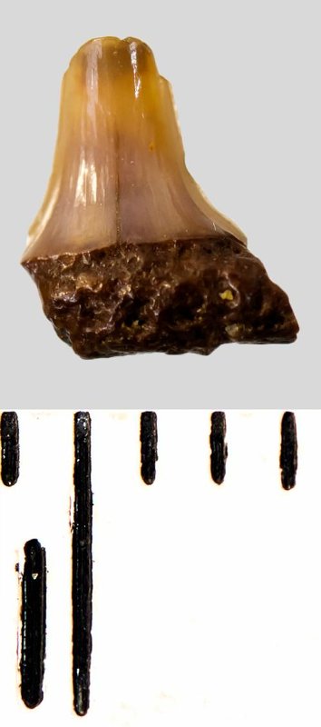 Коронка мелкого бокового зуба коричневого цвета, колюще-режущего типа, S-образно изогнутой, с гладким режущим краем. С лингвальной стороны у основания коронки на эмали имеется скульптура в виде слабой продольной струйчатости. Корень бурый, сохранился фрагментарно.