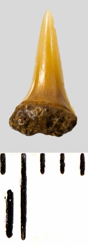 Зуб. Акула. Eostriatolamia subulata (Agassiz, 1843). Классификация: Хордовые Chordata, Позвоночные Vertebrata, Хрящевые рыбы Chondrichthyes, Пластиножаберные Elasmobranchii, Акулы Selachii, Ламнообразные Lamniformes, Песчаные акулы Odontaspididae