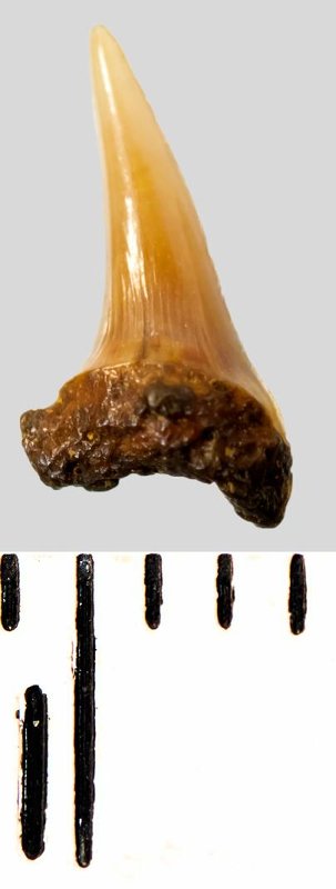 Зуб. Акула. Eostriatolamia subulata (Agassiz, 1843). Классификация: Хордовые Chordata, Позвоночные Vertebrata, Хрящевые рыбы Chondrichthyes, Пластиножаберные Elasmobranchii, Акулы Selachii, Ламнообразные Lamniformes, Песчаные акулы Odontaspididae