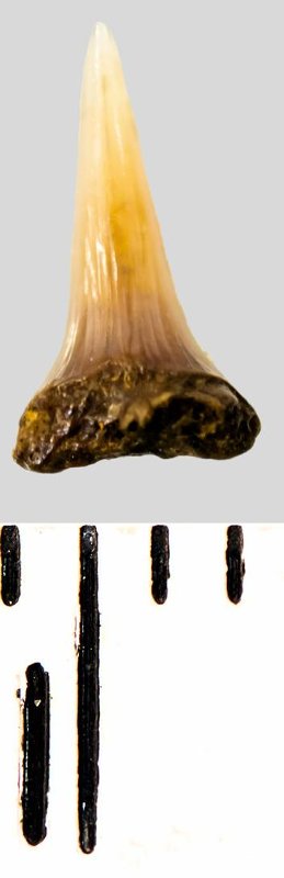 Зуб. Акула. Eostriatolamia subulata (Agassiz, 1843). Классификация: Хордовые Chordata, Позвоночные Vertebrata, Хрящевые рыбы Chondrichthyes, Пластиножаберные Elasmobranchii, Акулы Selachii, Ламнообразные Lamniformes, Песчаные акулы Odontaspididae