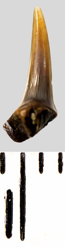 Зуб. Акула. Eostriatolamia subulata (Agassiz, 1843). Классификация: Хордовые Chordata, Позвоночные Vertebrata, Хрящевые рыбы Chondrichthyes, Пластиножаберные Elasmobranchii, Акулы Selachii, Ламнообразные Lamniformes, Песчаные акулы Odontaspididae