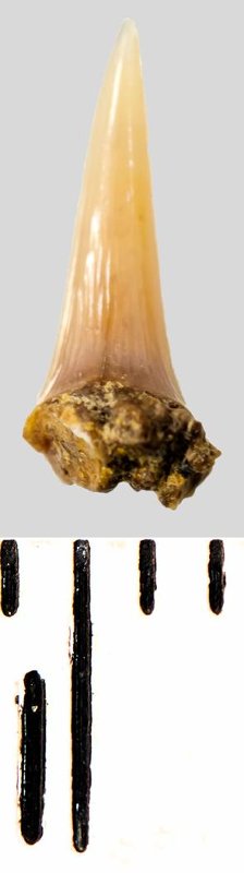 Зуб. Акула. Eostriatolamia subulata (Agassiz, 1843). Классификация: Хордовые Chordata, Позвоночные Vertebrata, Хрящевые рыбы Chondrichthyes, Пластиножаберные Elasmobranchii, Акулы Selachii, Ламнообразные Lamniformes, Песчаные акулы Odontaspididae